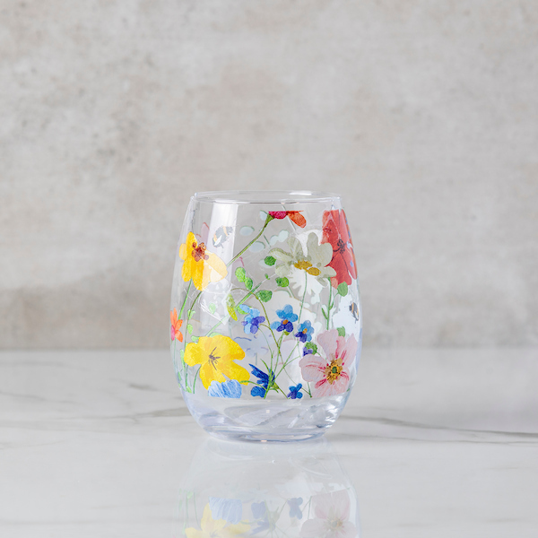 The Wildflower Stemless Wine Glass coordinates with the Blossoms & Bees Collection.