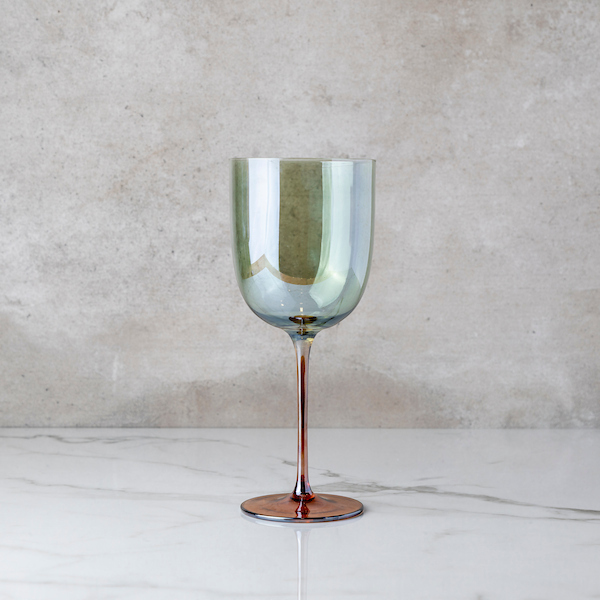 The Luster Sage Stemmed Wine Glass coordinates with the Luster Collection.